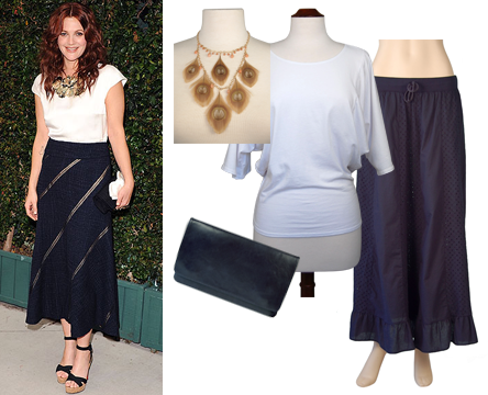 Drew Barrymore and boyfriend Will Kopelman attend Chanel’s benefit dinner for the Natural Resources Defense Council’s Ocean Initiative. Drew wore a white blouse, ankle length navy skirt, neutral tone bib necklace and solid clutch. This outfit is simple but so elegant and can easily be dressed down. You can put together a similar look for less right now on Badjoan.com with the following pieces: